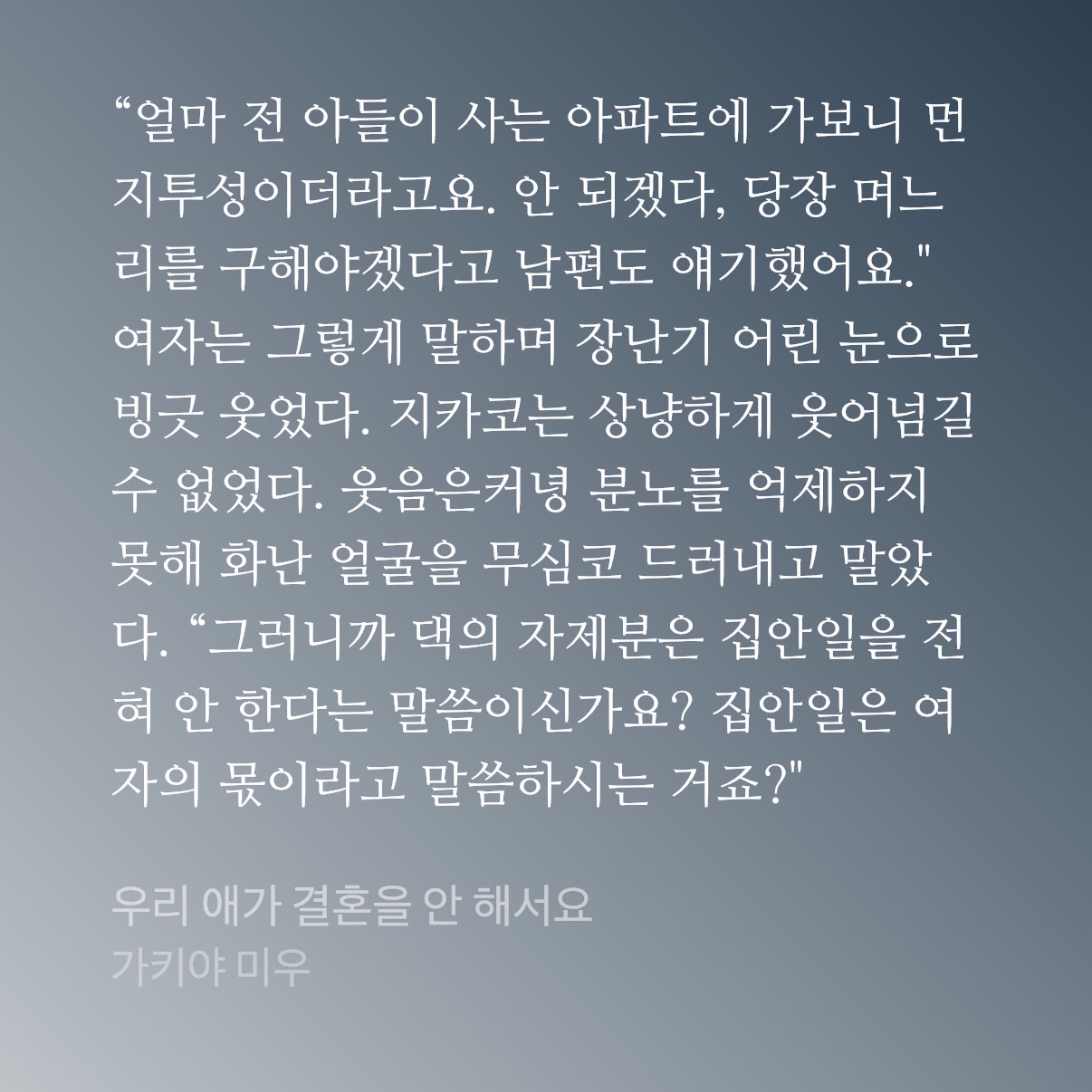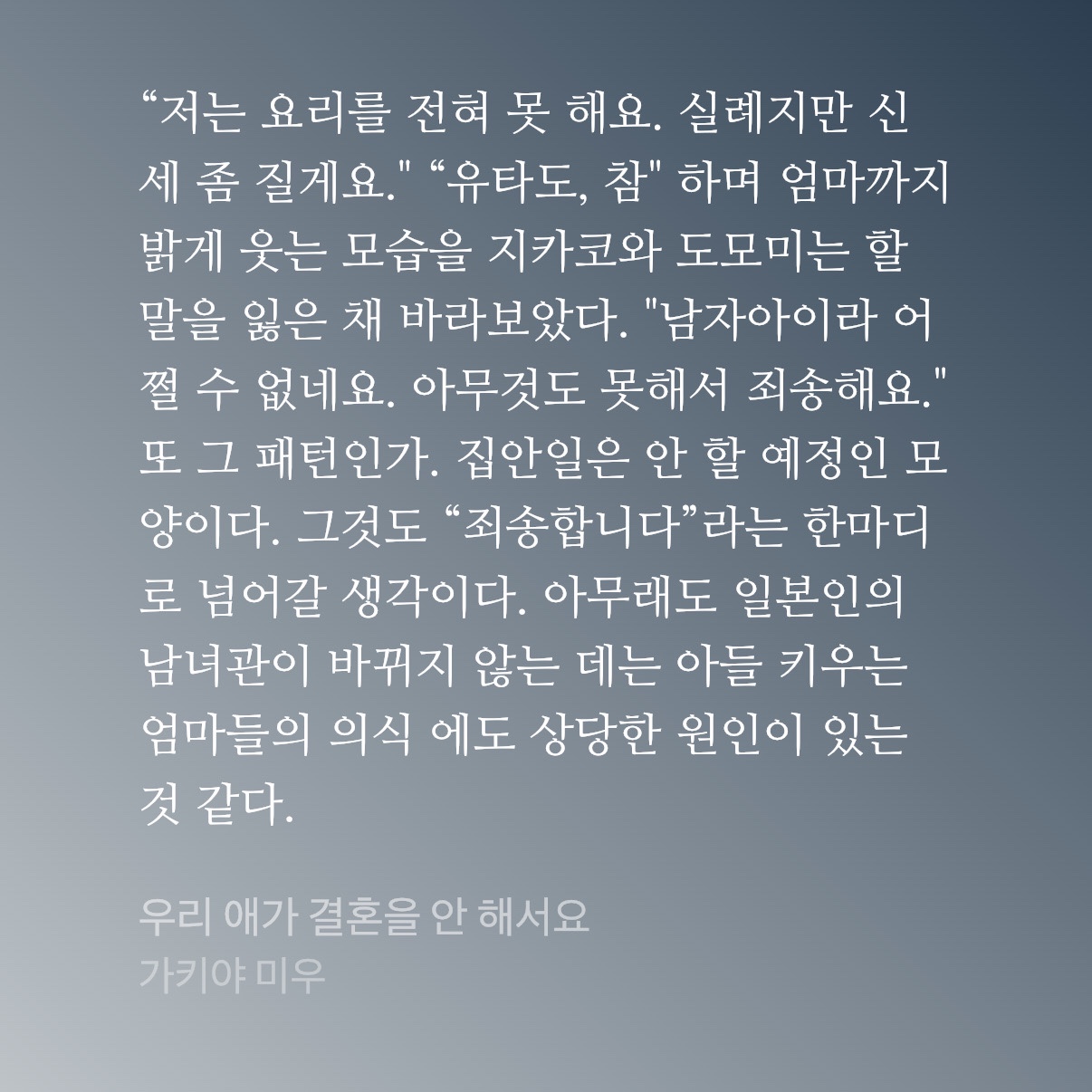 단순히 결혼문제를 다룬 소설이 아니라, 그 이면에 있는 가정 내에서의 역할분담과 여성에 대한 사회적 기대, 그리고 남자아이의 엄마로서의 고민에 대해 한번 생각하게 해 준 내용이었다.