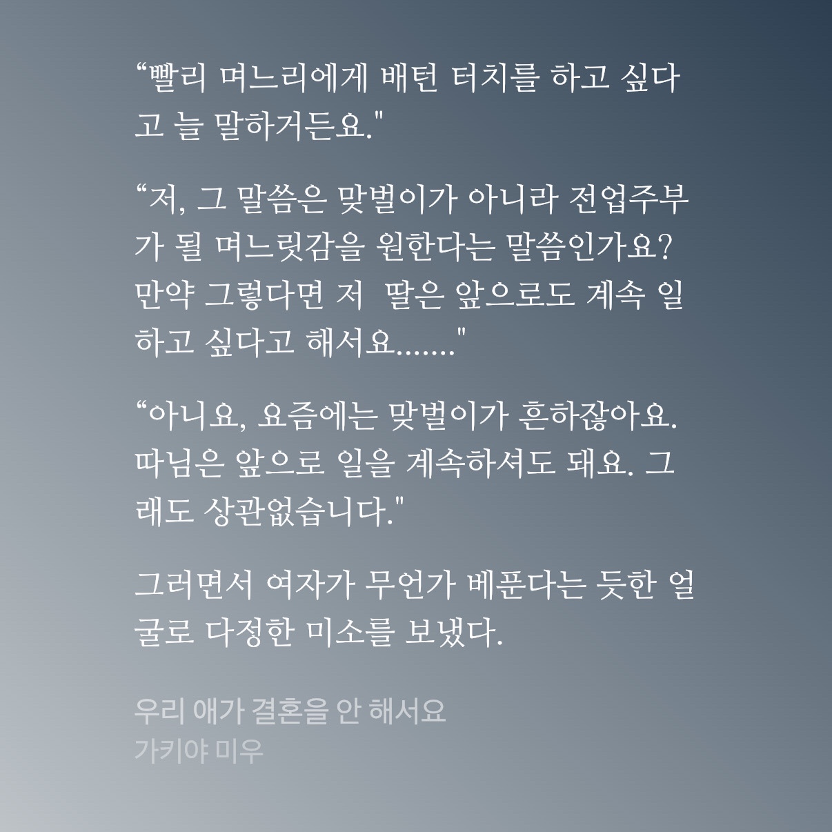 전작에서 평생을 가족 수발만 해온 엄마가 사라짐으로써 가족들이 점차 변화하는 내용을 그린 저자는, 이번에는 혼자 남을 외동딸을 위해 대리 맞선을 보러 다니는 부모의 모습을 그리고 있다.